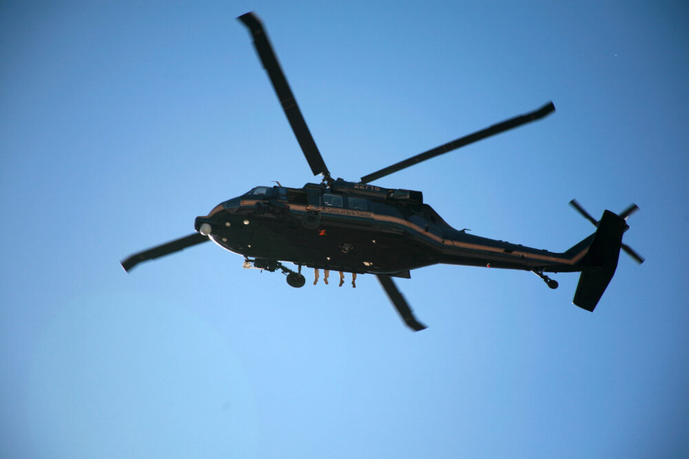 Helicopters operating in remote environments can use hybrid RF/5G transmission systems